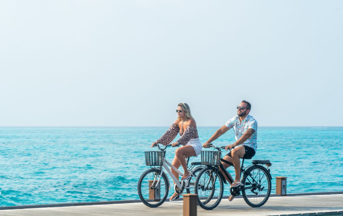 Adventure seekers are equally well catered for. The resort’s sports and recreation centre features professional tennis courts, a modern gym, and scenic cycling trails through the island’s natural landscapes. The surrounding waters offer snorkelling, diving, and a range of water sports, including kayaking, paddleboarding, and jet skiing. Guided excursions and marine experiences further allow guests to explore the Maldives’ vibrant reefs and abundant marine life.
