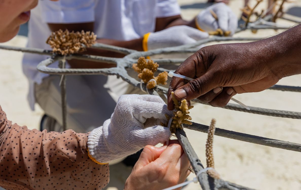 The process begins with the careful collection of healthy coral fragments, guided by the resort’s marine biologist. These fragments are secured onto coral frames and placed in strategic positions in the resort’s coral garden, where conditions support natural growth and marine biodiversity. Guests are invited to adopt their chosen coral frame, take part in the planting process, and receive ongoing updates on its development, including photos shared every six months.